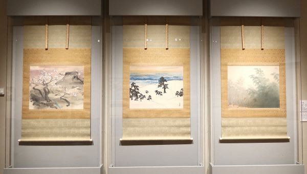 横山大観の《松(白砂青松)》(中央)、川合玉堂の《竹(東風)》(右)、川端龍子の《梅(紫昏図)》(左)。 近代日本画の巨匠が描いためでたさも極まる豪華3幅対の《松竹梅(しょうちくばい)》。お正月から豊かな気持ちになります。