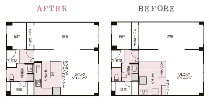 キッチンの面積と位置はほぼそのまま、2方向から出入りできるアイランド型に。