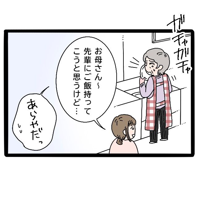 そして、食後の片づけをしていた時のこと、「お母さん~、先輩にご飯持って行こうと思うけど・・」と声をかけると、「あらやだっ」お母さんが慌てたように言いました。