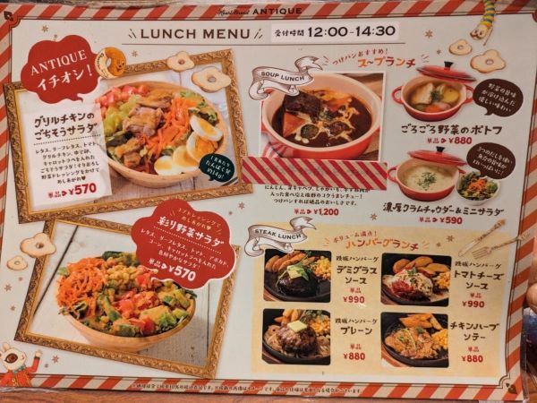 福岡県内には「ハートブレッドアンティーク 」が7軒あるのですが、ランチメニューがあるのは、ここ「福岡天神店」だけなんです!ランチのメニュー(12:00~14:30)はこちらです。お店のイチオシは「グリルチキンのごちそうサラダ」だそうです。このサラダは数量限定で、平日は6皿、土日祝日は8皿とのことですよ。(夏期は平日8皿、土日祝日10皿)