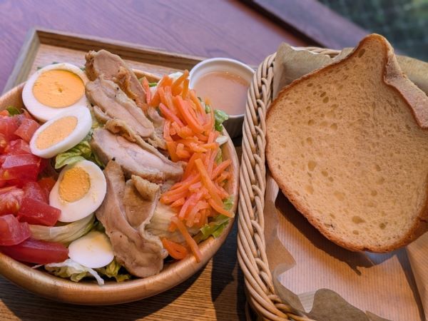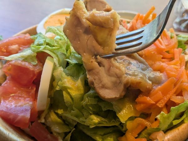窓際の席でまったりと、車や人間ウオッチをしながら待っていたら、運ばれてきました。凄いボリュームです!たんぱく質が14gあるだけに、チキンも大きいですし、ゆで卵もたっぷりです。そして驚くような量の野菜が入っていますから、とってもヘルシーですよ。
