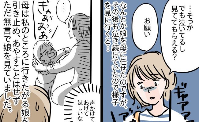 それでも何度もお願いして娘をあやしてもらうことにしたのですが、泣きわめく娘。私はお昼ご飯を作っていたのですが、あまりに泣くので娘のところに行こうとすると「来なくていい!! さっさと、ご飯を作ってしまいなさい!」と言われました。実母は私のところに行こうとする娘を引き止め、ただ無言で娘を見ていました……。