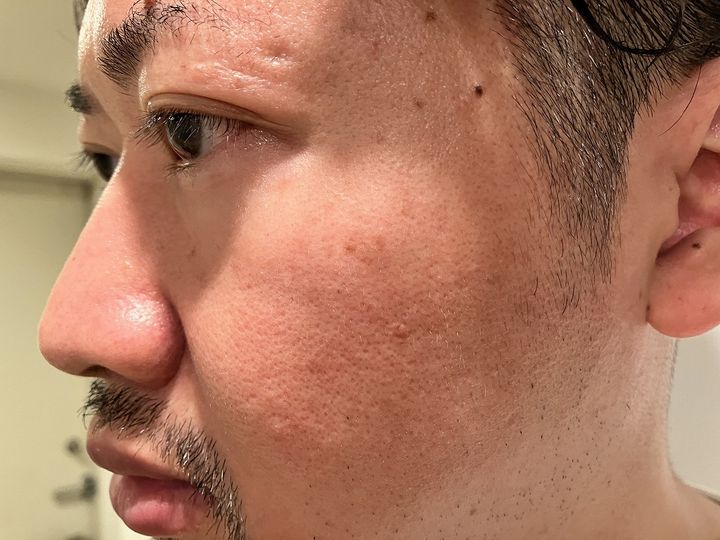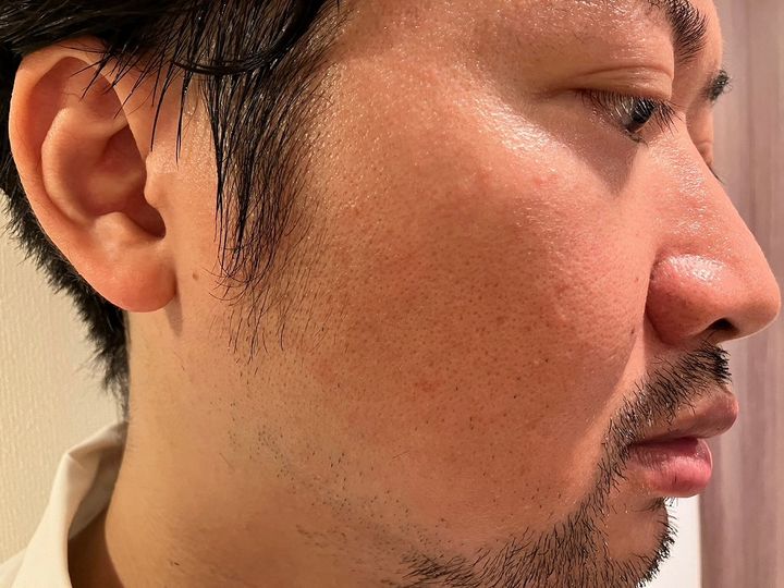 右頬は肌にハリがなく、くすみも。固形石鹸で身体を洗う延長で顔も洗っていたので、肌の表面にはざらつきが目立ち、シミも大きなものから小さなものまで。