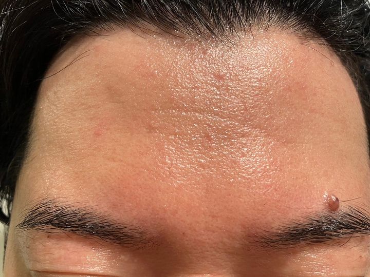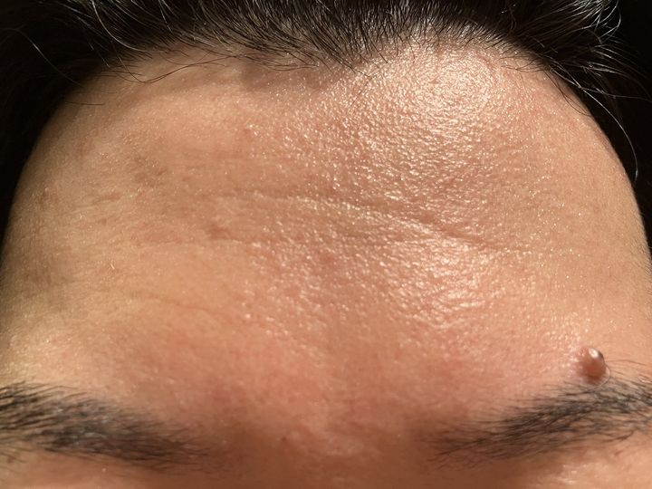 おでこの中央部分に深いシワと薄いシワが。微かに薄いシミもあり、キメも荒くなっているように感じます。