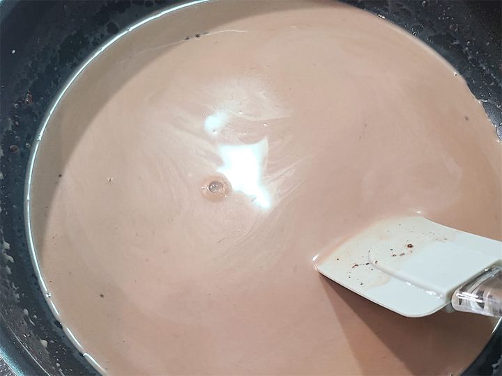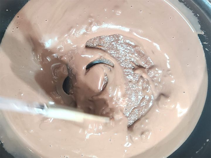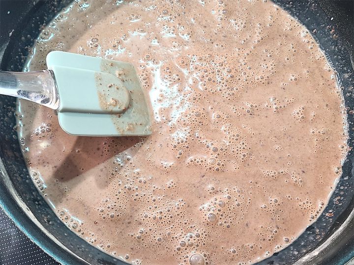1分くらい混ぜながら加熱していくと、気泡がなくなりなめらかになります。