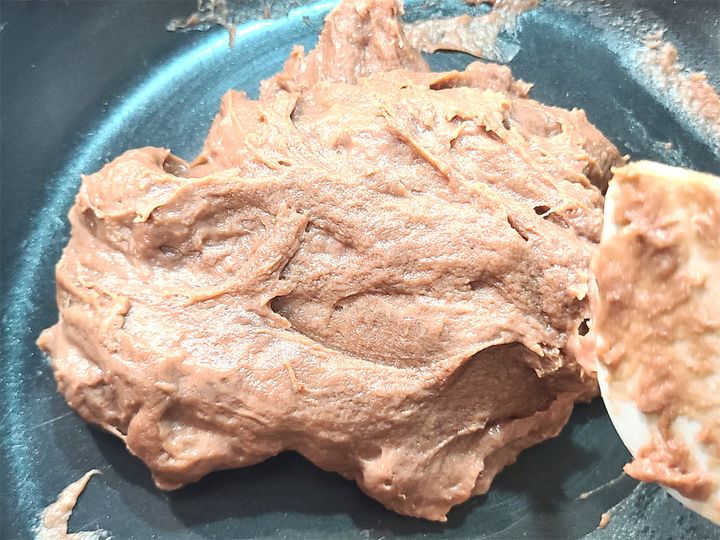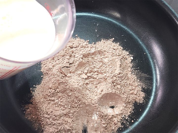 2. フライパンに1を入れ、牛乳を2~3回に分けて加えます。まだ火は点けません。ダマにならないように、混ぜながら牛乳を加えていきます。