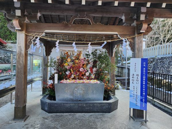 手水舎には、色鮮やかなお花があしらわれた献花花手水(はなちょうず)が行われていて、うっとりしました。