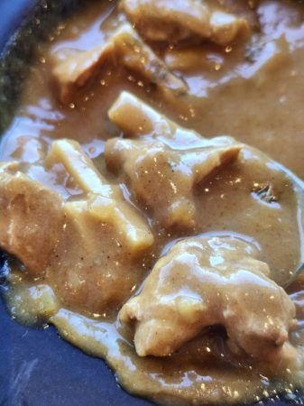とろみとコクのあるカレーには鶏肉とたけのこがたっぷり入っていて、食感がたまらない。