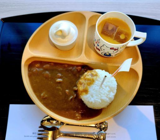 こちらはキッズカレー!カレーライスにオレンジジュースと白蛇に見立てたソフトクリーム付き。