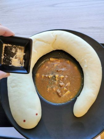 なんとも可愛らしい白蛇ちゃん、可愛いだけではなく、熱々のナンがフワフワで美味しい。