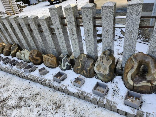 社殿の南側には、「蛇紋石」が並んでいて、手や財布で蛇の模様を撫でると金運がアップするといわれています。