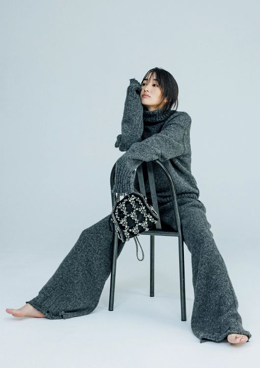ニット¥243,100、ニットパンツ¥224,400、バッグ『ファラベラ タイニー』[W18×H17.5×D6]¥364,100/以上ステラ マッカートニー(ステラ マッカートニー カスタマーサービス)
