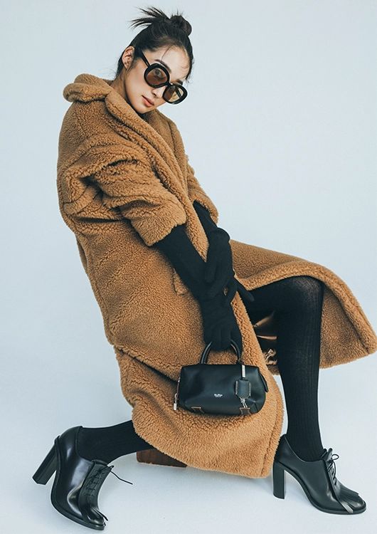正統派の流れを汲みつつ、カジュアルな魅力も持つテディベアコートは、ボリュームがあるにもかかわらず軽い着心地が魅力。体を優雅に包む主役を生かすべく、ほかは黒で統一して、往年の女優のようなクラシカルなムードを楽しみたい。