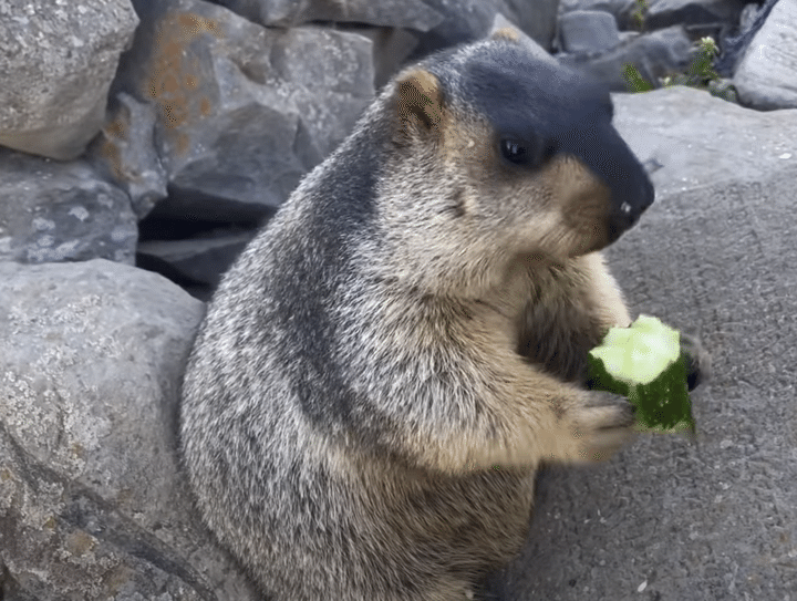3. よいしょっと。 岩に腰掛けて、食事を始めるマーモットさん。