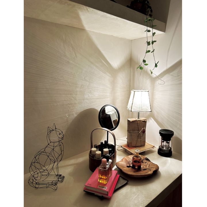FUEGUIA 1833などの香水や猫のオブジェが麻のランプでおしゃれに照らされる、お気に入りの場所。