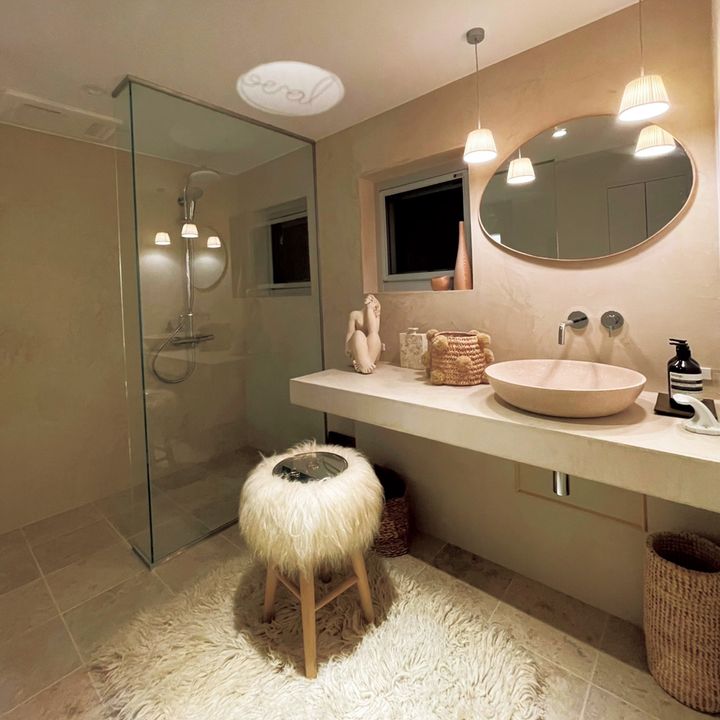 ハロゲンランプやベージュの壁が透明感ある肌に見せてくれる。ランプが鏡やガラスに映り、LOVEの文字が天井に映る遊び心も素敵。