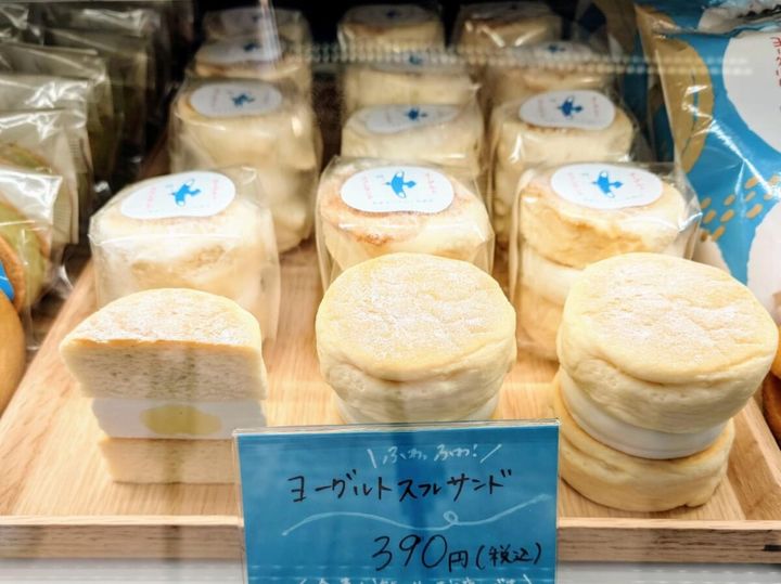 手のひらサイズの「ヨーグルトスフレサンド」(税込390円)。ふわふわのスフレパンケーキ生地でヨーグルトクリームを挟んでいます。分厚くて満足度も高いスイーツ!