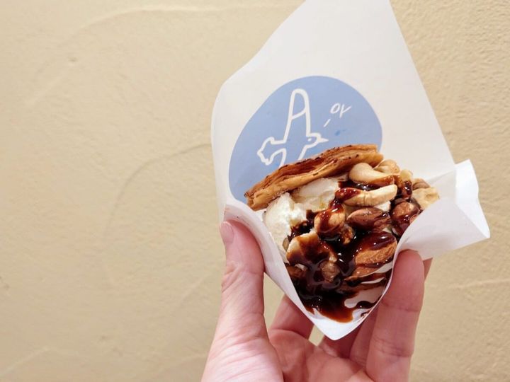 ワンハンドスイーツの「生ヨーグルトバターサンド」。12時間以上水切りしたヨーグルト入りのオリジナルバタークリームをサクサクのパイ生地で挟んでいます。