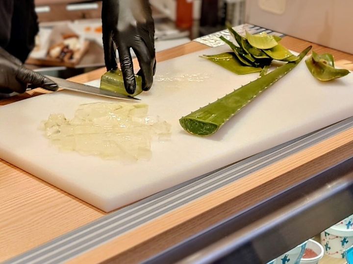 ヨーグルトにトッピングするアロエは「伊豆アロエ」を葉の状態で仕入れて店内で加工しています。農薬を極力使わず海草などを肥料として栽培された生アロエ。プルンプルンで、海からのミネラルを豊富に含んでいます!