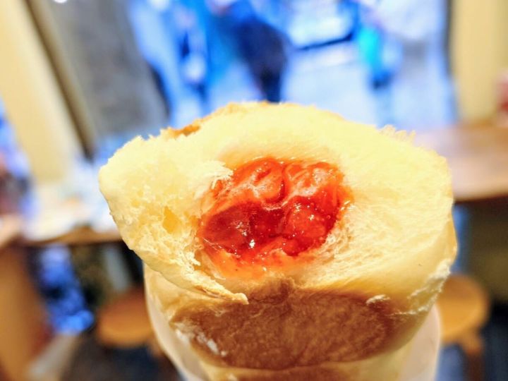 隣接のベーカリー「パン樹 久遠」で焼きあげられたパンが使われており、パンの中には果肉入りのイチゴソース、水切りヨーグルト入りのオリジナルバタークリームが入っています。甘さと酸味のバランスが絶妙なだけでなく、濃厚なクリームの食感も素晴らしい! ソフトクリームのように持てるので、食べ歩きにもよさそうです。