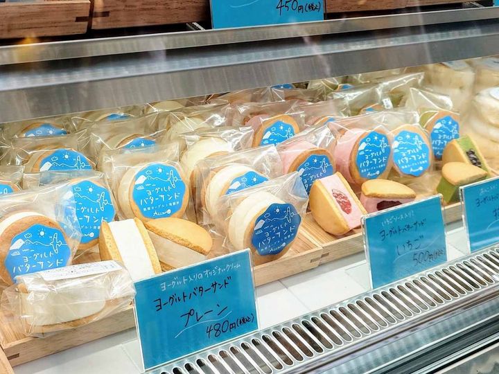 ヨーグルト発酵所では、食べ歩きにうれしいメニューだけでなく、焼き菓子やバターサンドなども購入可能。「プレーン」(税込480円)、「いちご」(税込500円)、「抹茶」(税込500円)の3種類がそろうバターサンドは、持ち帰りしやすい個包装。濃厚なバタークリームをサクサクのクッキーでサンドされています。