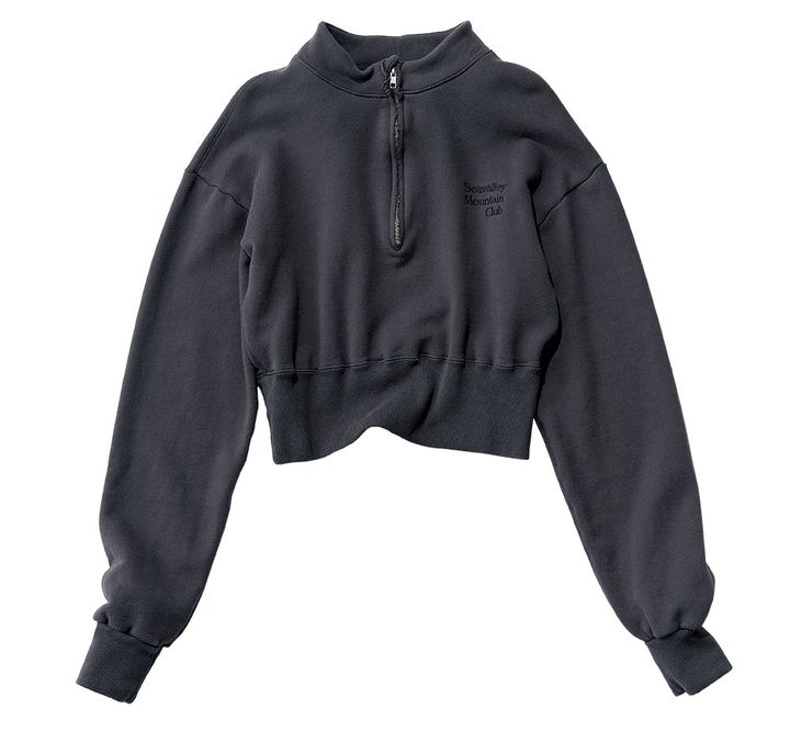 ハーフジップが新鮮なバランスを作るスウェットトップス。短丈も今年らしい。¥30,800(シー/エスストア)