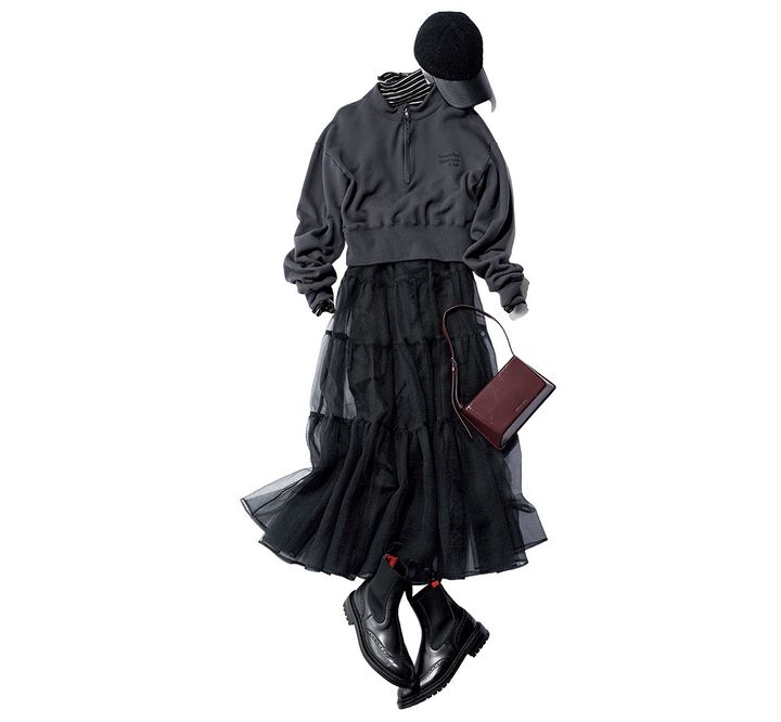 スウェットトップス¥30,800(シー/エスストア)カットソー¥5,990(アンフィーロ)スカート¥39,600(ウィム ガゼット/ウィム ガゼット 青山店)バッグ¥10,900(チャールズ&キース/チャールズ&キース ジャパン)ブーツ¥132,000(トリッカーズ/トリッカーズ 青山)キャップ¥29,700(ヘレンカミンスキー/ヘレンカミンスキー ギンザシックス)