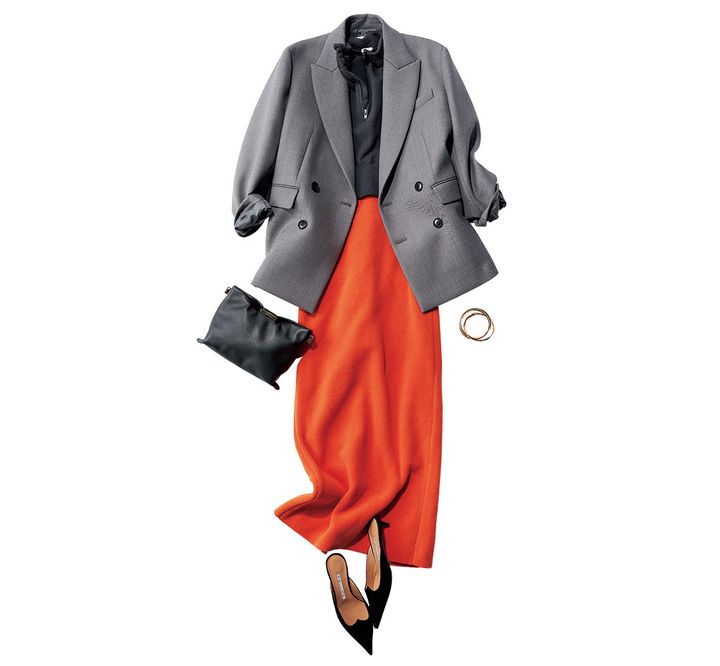 スウェットトップス¥30,800(シー/エスストア)ジャケット¥39,930(ネイヴ)スカート¥121,000(コリーン アレン/ロンハーマン)バッグ¥35,200(プンティ/ショールーム セッション)ミュール¥64,900(ペリーコ/アマン)3連バングル¥19,800(アビステ)