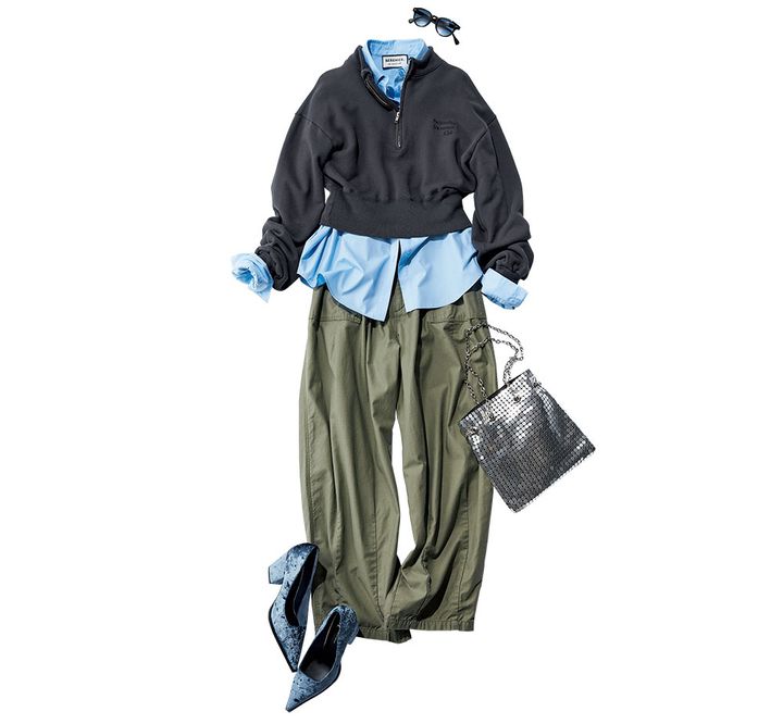 スウェットトップス¥30,800(シー/エスストア)シャツ※ボウタイ付き¥28,600(THIRD MAGAZINE)パンツ¥31,900(RHC/RHC ロンハーマン)バッグ¥7,260(ル タロン/ル タロン 有楽町マルイ店)パンプス¥13,860(シー ユナイテッドアローズ/ユナイテッドアローズ カスタマーサービスデスク)サングラス¥50,600(モスコット/モスコット トウキョウ)