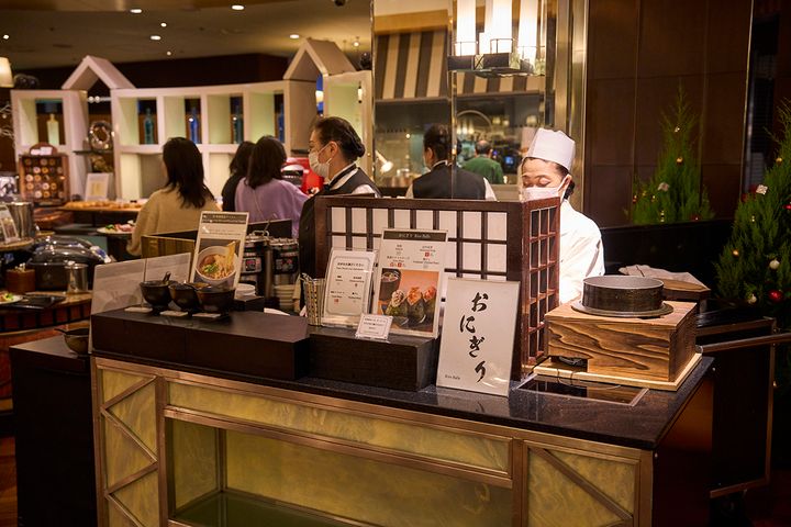 「コーヒーショップ『SATSUKI』」では、和食のメニューも豊富です。こちらはおにぎりコーナー。朝食ブッフェのおにぎりというと、あらかじめ握られたものがずらりと並んでいるのをイメージしがちですが、「新・最強の朝食」をうたう「コーヒーショップ『SATSUKI』」は、ひと味違います。