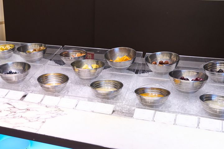 ヨーグルトバーには、ドライフルーツやナッツ類など、9種類のシリアルが。さらにメロン、ブルーベリー、洋梨、柿など10種類以上のフルーツ、その横にはプルーンやアロエも並んでいました。