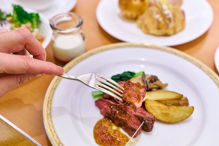 ビーフステーキにおろしポン酢とソースをかけていただきます。朝の胃には少し重いかな……と思いきや、やわらかく口の中でとろける味わいでぺろりといただくことができました。朝のステーキ、たまにはいいかも! ご褒美感を存分に感じながら、味わいましょう。