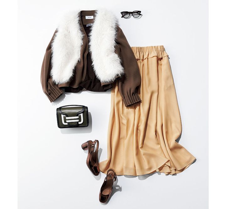 ジレ¥29,920(ユナイテッドアローズ/ユナイテッドアローズ 丸の内店)ブルゾン¥66,000(アストラット/アストラット 新宿店)ニット¥39,600(コンテ/conte 青山店)スカート¥45,100(ebure/リトルリーグ インク)バッグ¥152,900(ピエール アルディ/ピエール アルディ 東京)パンプス¥13,200(シー ユナイテッドアローズ/ユナイテッドアローズ カスタマーサービスデスク)サングラス¥45,100(アイヴァン/アイヴァン 東京ギャラリー)