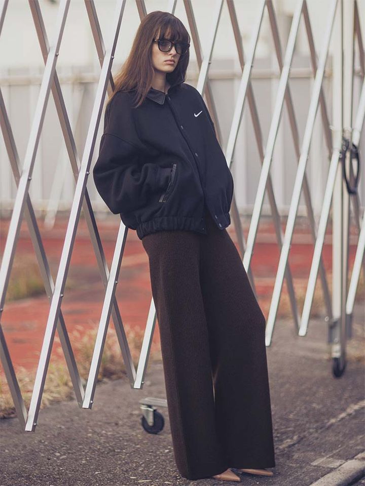 【POINT】フォルムが美形だから、ニットでブラウンを選んでもほっこり見えない。ほどよくワイドなすそから鋭いつま先をのぞかせることで、スポーティなブルゾンも洗練される。