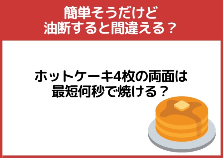 意外と間違える!ホットケーキの片面を焼くのに30秒かかるとき、4枚の両面は最短何秒で焼ける?