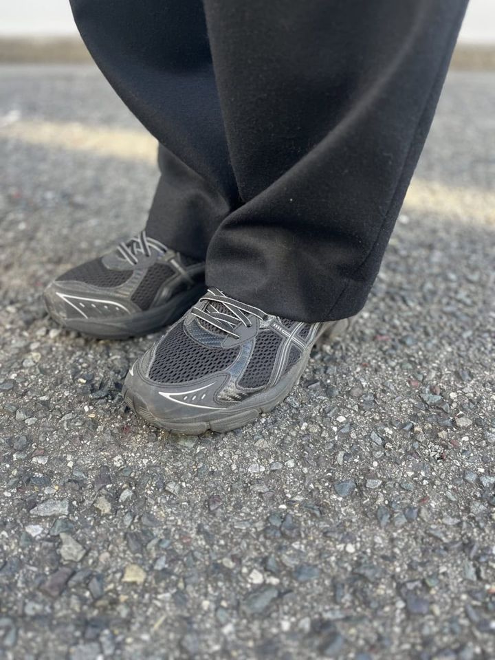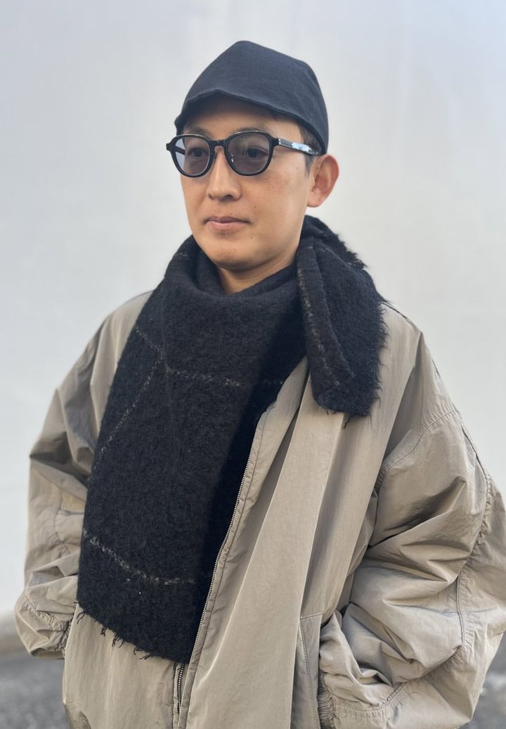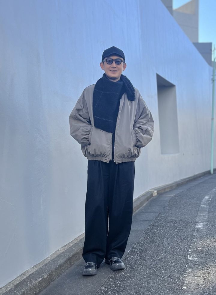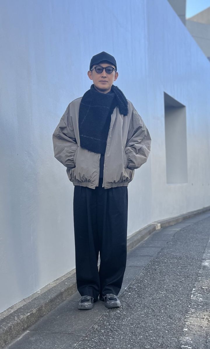 シュタインのブルゾンとパンツ、ジョン スメドレーのニット、コズミックワンダーのキャップ、カーニーのメガネ、シーオールのマフラー、ジョウンド×アシックスのスニーカーは水澗さんの私物