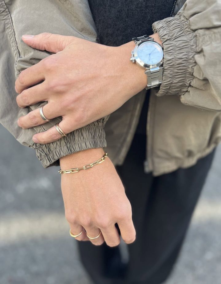 カルティエの時計とブレスレットをはじめ、ジュエリーはシンプルながらもセンスのよさが光るセレクト。ゴールドとシルバーをミックスさせているのも技アリです