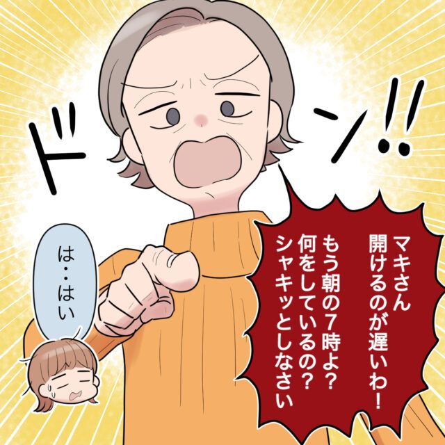 「マキさん、開けるのが遅いわ!もう朝の7時よ?何をしているの?シャキッとしなさい」入ってくるなりお小言を言う義母の勢いに驚いて「は・・はい」と返事をするマキさん。