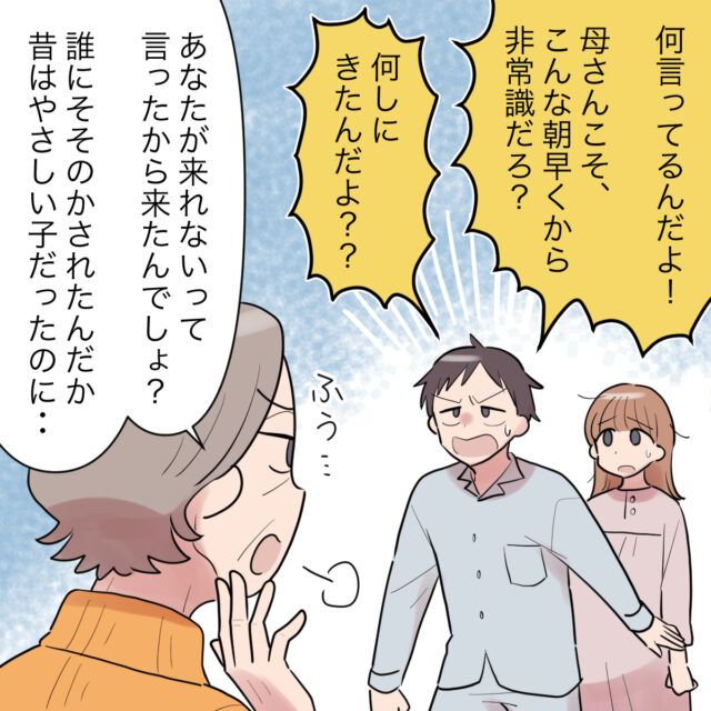 すると、「何言ってるんだよ!母さんこそ、こんな朝早くから非常識だろ?何しに来たんだよ??」ゆうさんが呆れながら怒った口調で義母を責めると、「あなたが来れないって言ったから来たんでしょ?誰にそそかされたんだか、昔はやさしい子だったのに・・」とため息をつきながらそう言う義母。
