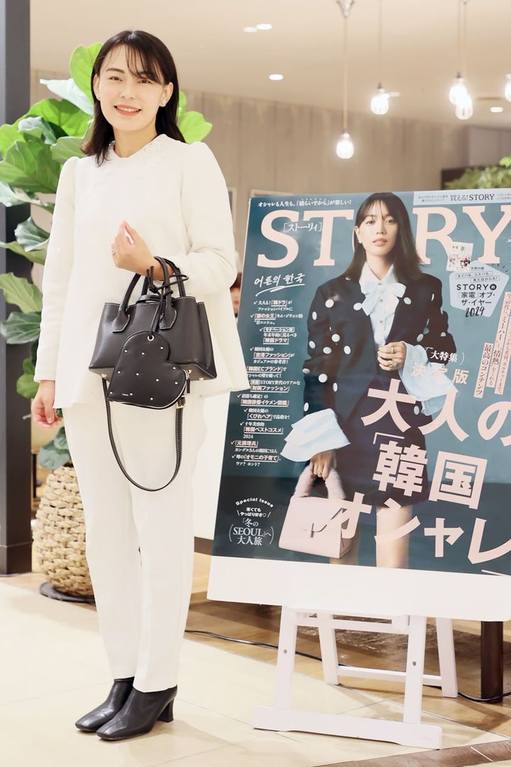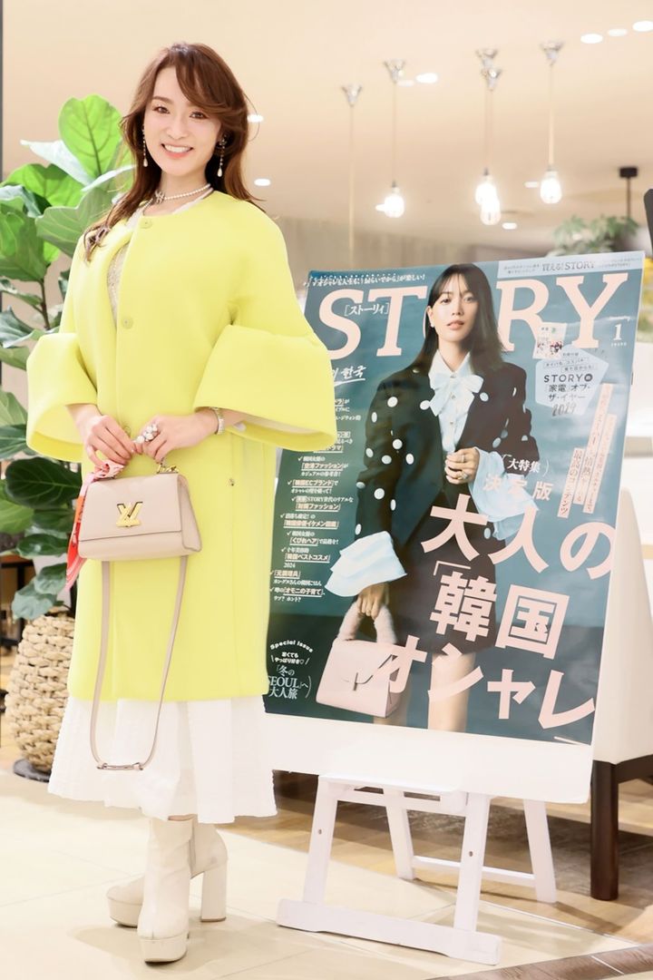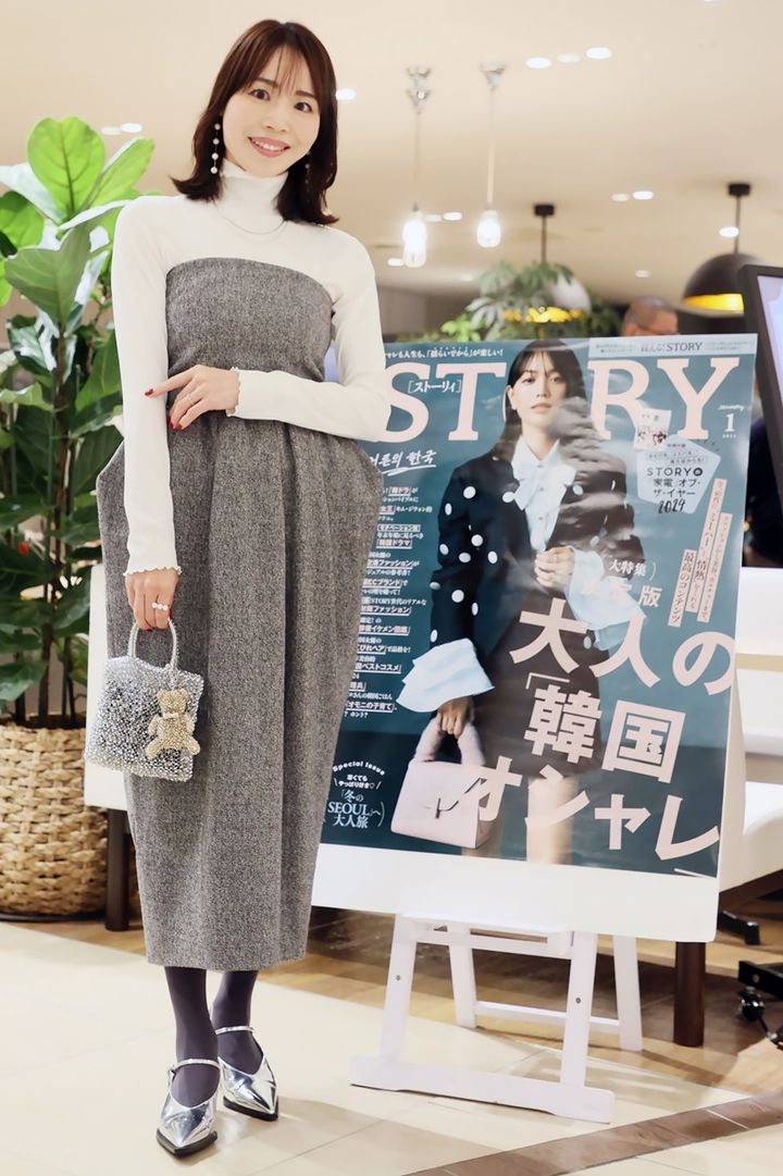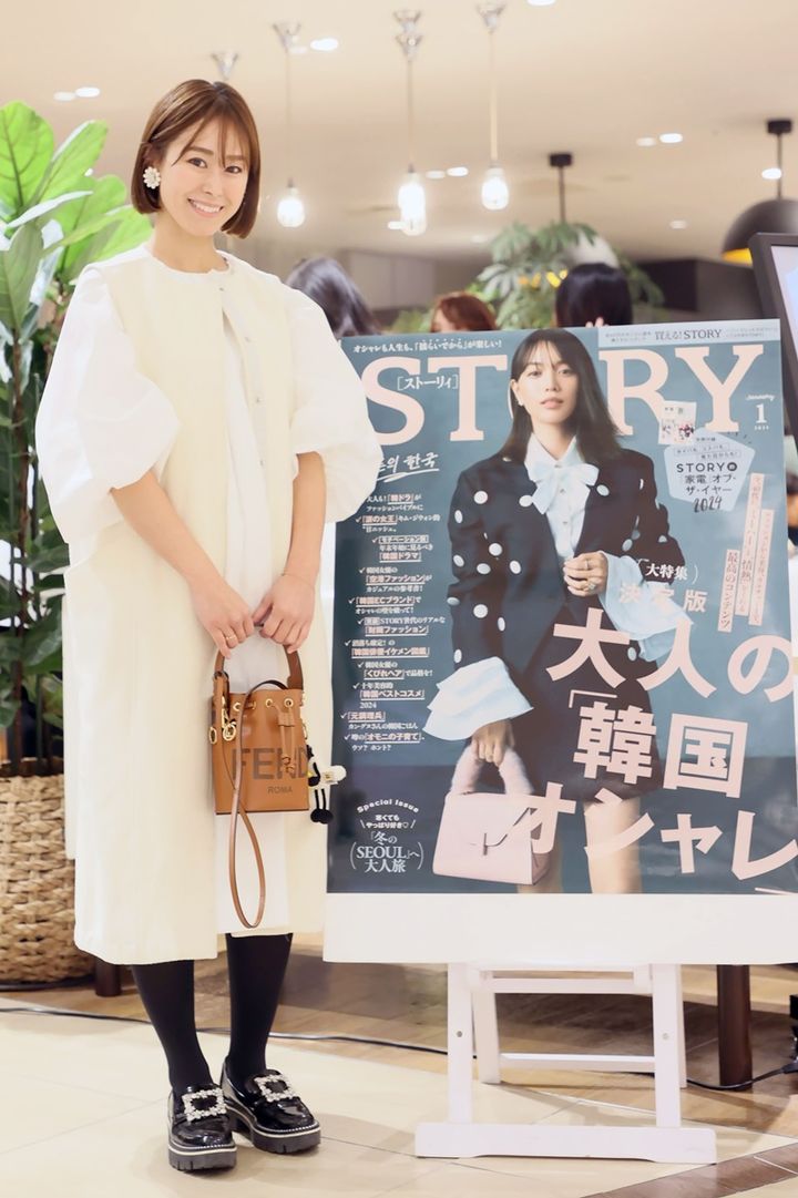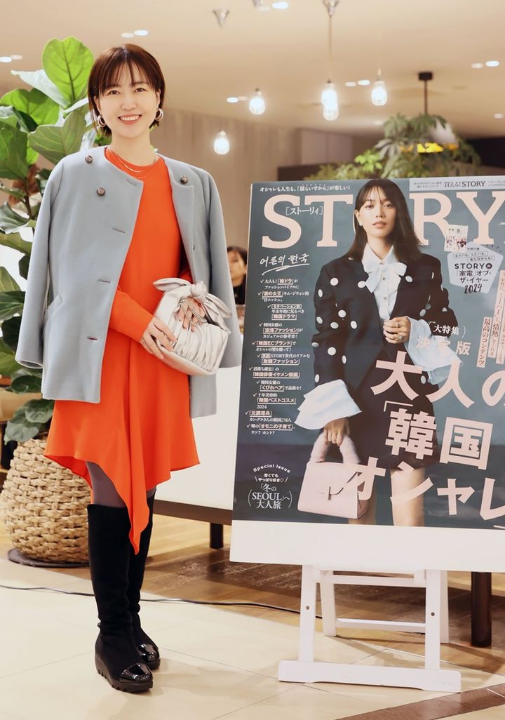 三浦亜由美さん「クリスマスシーズンにふさわしい、とことんHappyな色づかいを意識しました。私はSTORYのコーディネートの大ファンで(特に野呂佳代さんのマシュマロさんコーデが好きです)、それをお手本に組みました」という三浦さん。イベント終了後には「今回のイベントで、雑誌STORYならではのワクワクを肌で感じることができました。STORYがあれば40代からの人生は、楽しくて最高だと思えます」とお話しくださいました! コート/ZAPA (ZAPA Paris)、ワンピース/STELLA McCARTNEY、ブーツ/HILLS AVENUE、バッグ/ADAM ET ROPE、イヤリング・ネックレス/Magnolia