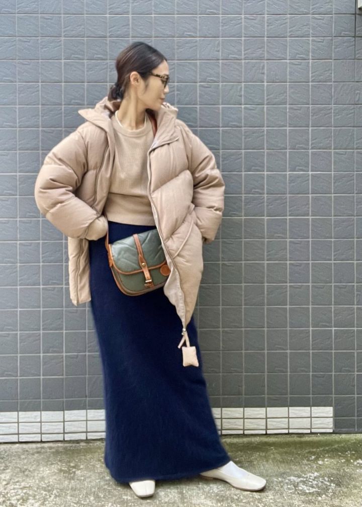 「この写真を撮影したのが初雪予報の日だったので、とっても暖かく、アシンメトリーのジップが印象的なライトのダウンジャケットを主役にスタイリングしました。ダウンがアノラックデザインなので、アウトドアにルーツがあるハンティングワールドのバチューのバッグをセレクトし、まとまりを意識。一方でカジュアルになりすぎない様に、レディなボトムとシューズをあわせてバランスを取りました」