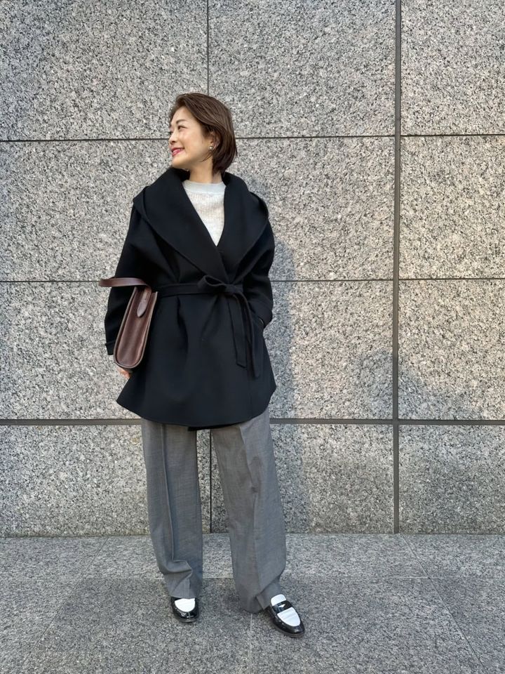 「定番のブラックコートは、上質なフーデットラップコートにすることで新鮮なコーディネートに。女性らしい雰囲気のコートに合わせてボトムはワイドパンツに、ハンサムなバッグやシューズを合わせることでスタイリングのバランスを取りました」