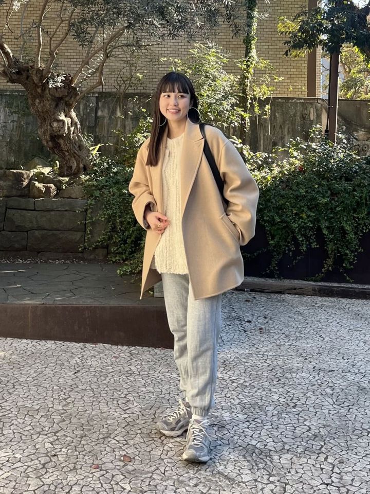 「ジャケットコートにムートンジレをレイヤードして、コーディネートに立体感がでるように意識しました。ポステレガントのジャケットコートはボタンがなくガウンのようにラフに着られるので、スウェットパンツにスニーカーというカジュアルな装いにもマッチしやすくお気に入りです。柔らかな素材感と優しい色合いを引き立てるため、大ぶりのシルバーピアスとブラックレザーのバッグで、スタイルにシャープなアクセントを加えました」