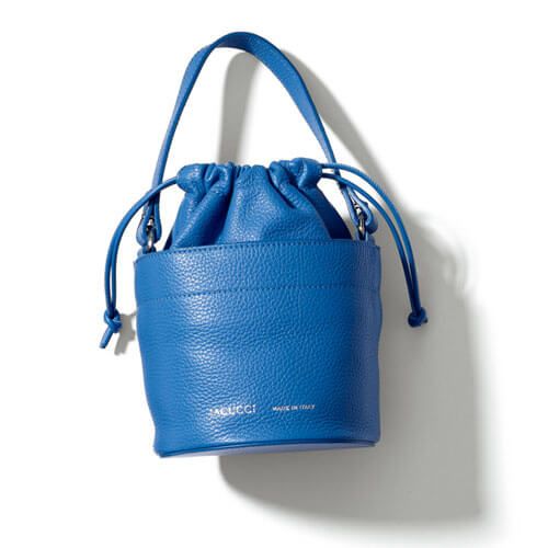 発色のいいブルーバッグは冬服のアクセントに最適。マチのあるバケツ型で、財布やスマホなど貴 重品がすっぽり入る収納力。