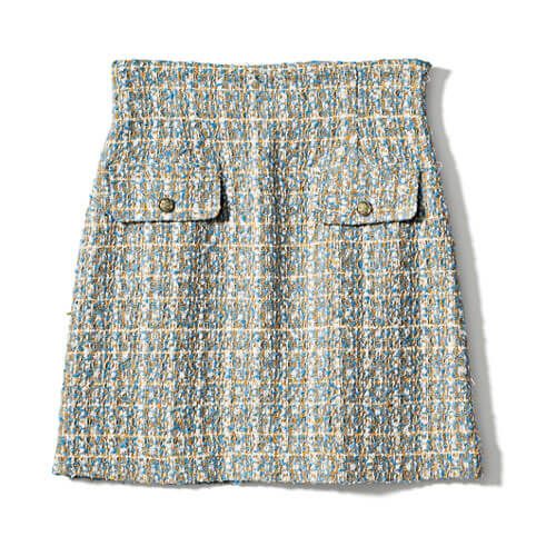 ブルーのツイードミニでレトロスタイルを新鮮に。まわりと差がつくブル ーのツイードスカート。同素材のジャケット とセットアップで着るとさらに華やか。