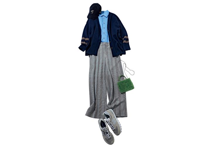 ラインカーディガン¥29,700/カデュネ シャツ¥5,489/ロペピクニック(ジュン) チェック柄パンツ¥15,000/PLST ミニバッグ¥36,300/アンテプリマ/ワイヤーバッグ(アンテプリマジャパン) スニーカー¥11,990/ニューバランス(ニューバランスジャパン) キャップ¥4,180/ニューエラ