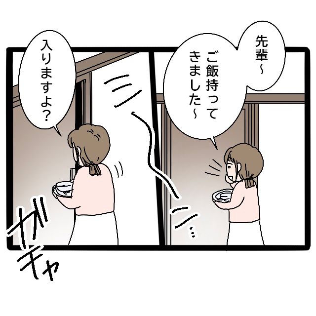 「コンコン」「先輩~ご飯持ってきました~」ノックして声を掛けても何も返事がありません。「入りますよ?」カオリさんはそう言って、静かにドアを開け中に入りました。