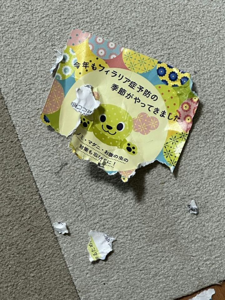 なんとそれは動物病院からのお知らせ。受診した際に血液検査をされることに気づいているのでは?と、時山さんは感じたようです。チラシを破ったところでどうにもならないのですが、全身で「病院はイヤ!」という気持ちを表現していると思うとかわいいですよね。