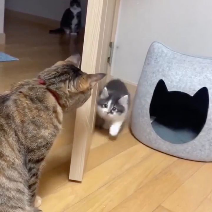 ドアの裏側に隠れている子猫を視認して、何事かと待ちかまえるサビトラ猫さん。子猫は怖いのと興味津々なのとワクワクなのとドキドキなのが入り交じって、やんのかステップから怖くて一目散のループモードに入ってしまっております。