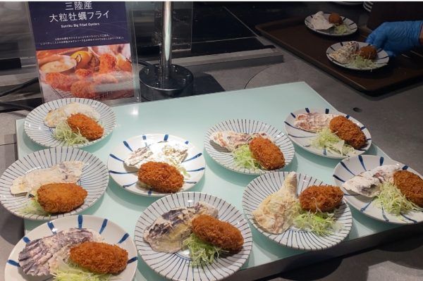ライブキッチンや宮城ならではの牡蠣料理、お寿司、サーモンの藁焼きなど盛りだくさん!大ぶりな牡蠣の釜飯美味でした!